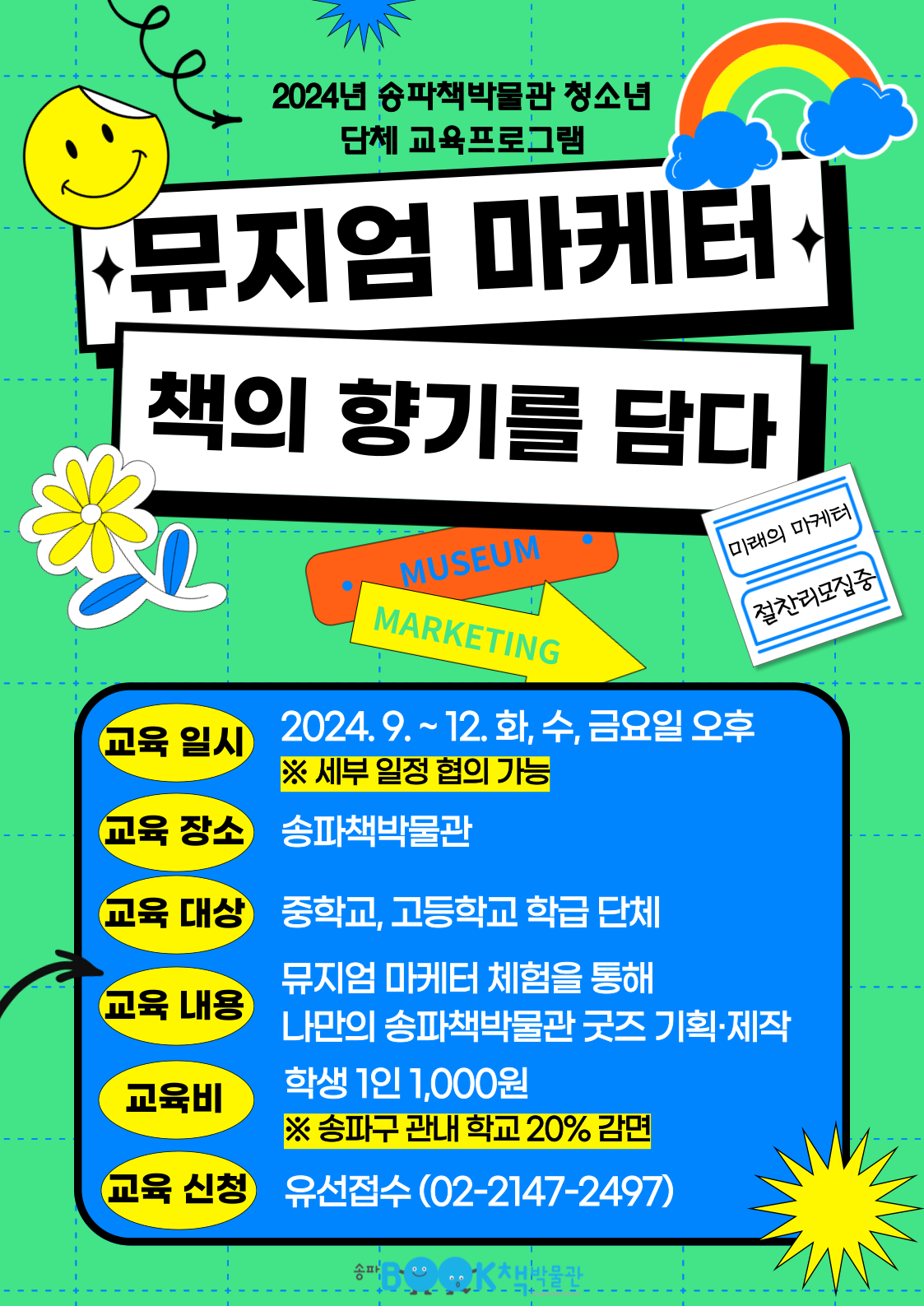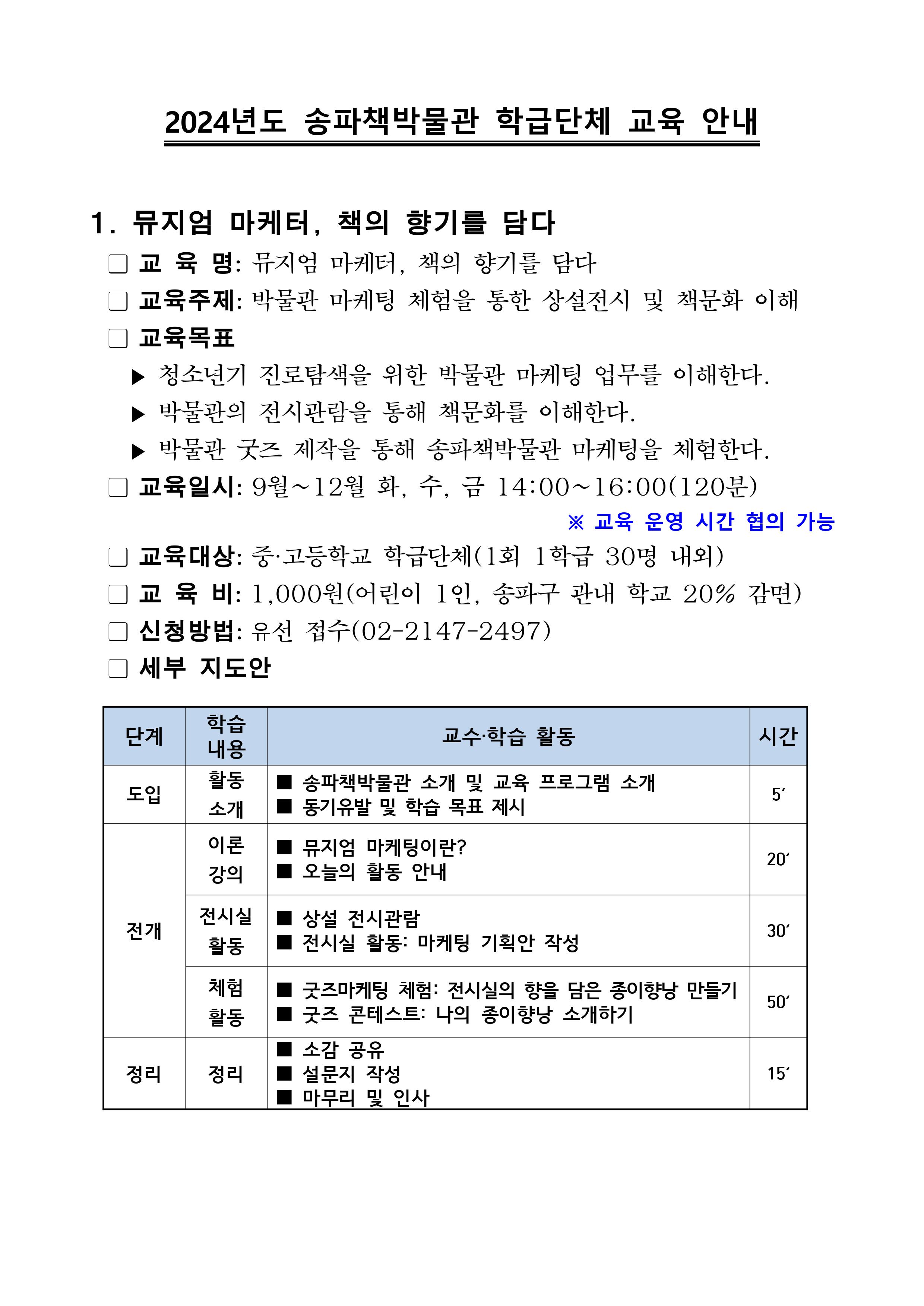 해당 표는 [중·고등 학급단체] 뮤지엄 마케터, 책의 향기를 담다주제의 교육에 대해 안내된 표입니다. 표의 구성은 대상, 장소, 접수기간, 교육기간, 교육시간, 요일, 모집인원, 교육문의 등으로 이루어져있습니다.